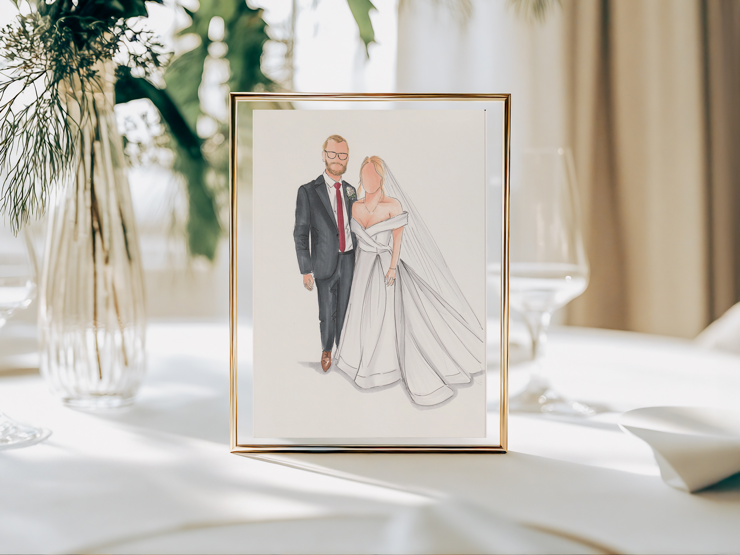 Guests will pose for a photo, usually during cocktail hour (or mingling time) or prior to the ceremony for larger packages, and the illustration will be created from the photo reference, so your guests can continue enjoying your special day.